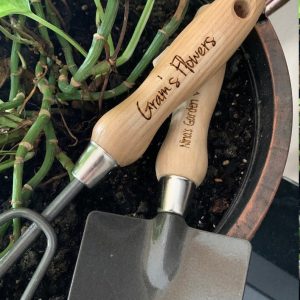 Personalized garden tool set makes a great gift for any gardener or flower enthusiast. Nice heavy duty steel set includes a trowel and raking/weeding tool. Each tool measures approximately 12″ in length. Also comes with a nice drawstring canvas bag to store the tools when not in use. Tools will be engraved on the wood handles with your choice of fonts, and include the name or short phrase you provide.